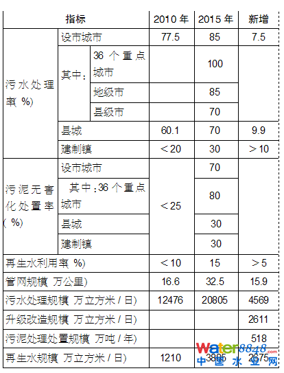 ——到2015年,污水處理率進(jìn)一步提高,城市污水處理率達(dá)到85%(直轄市、省會(huì)城市和計(jì)劃單列市城區(qū)實(shí)現(xiàn)污水全部收集和處理,地級(jí)市85%,縣級(jí)市70%),縣城污水處理率平均達(dá)到70%,建制鎮(zhèn)污水處理率平均達(dá)到30%。