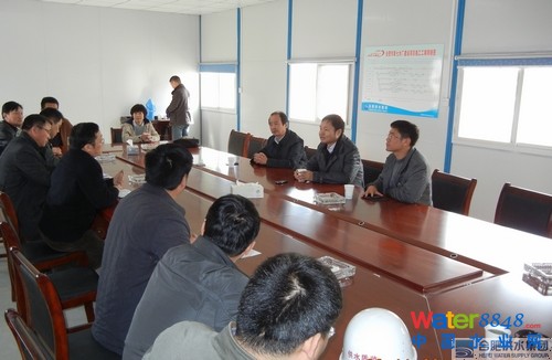 楊林一行先后來到環(huán)湖大道、湖光路、七水廠清水池、二級(jí)泵房及沉淀池等施工現(xiàn)場,了解項(xiàng)目進(jìn)展情況。在七水廠臨建會(huì)議室,相關(guān)部門負(fù)責(zé)人詳細(xì)匯報(bào)了管道安裝及廠區(qū)建設(shè)情況,并對(duì)建設(shè)過程中存在的困難和需要協(xié)調(diào)的問題進(jìn)行了說明。