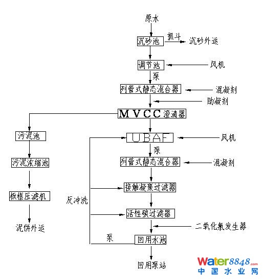原水首先進(jìn)入沉砂池去除顆粒比較大的煤顆粒后,進(jìn)入調(diào)節(jié)池進(jìn)行水量調(diào)節(jié)和均質(zhì),池中設(shè)置預(yù)曝氣系統(tǒng),間歇供氣,防止懸浮物沉淀,廢水調(diào)節(jié)后經(jīng)提升泵提升到管道混合器,通過投加絮凝劑,使廢水與絮凝劑充分混合后,進(jìn)入微渦流絮凝澄清器(MVCC澄清器),經(jīng)過絮凝沉淀,去除部分懸浮物后,進(jìn)入上流式曝氣生物濾池(UBAF),去除懸浮物和微量有機(jī)物后用泵將水泵入列管式靜態(tài)混合器,同時(shí)投加絮凝劑,完全混合的水進(jìn)入接觸凝聚過濾器、活性碳過濾器。徹底將懸浮物處理到回用標(biāo)準(zhǔn)后進(jìn)入回用水池投加二氧化氯消毒后準(zhǔn)備回用至使用點(diǎn)。經(jīng)過MVCC澄清器產(chǎn)生的物化污泥自動(dòng)排入污泥池,通過污泥泵提升至污泥濃縮池,污泥濃縮后經(jīng)過板框壓濾機(jī)脫水,脫水后污泥外運(yùn)處理。