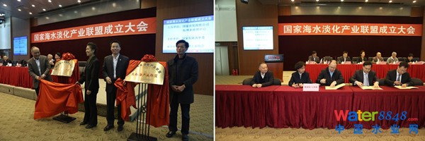 圖左:國家海水淡化產(chǎn)業(yè)聯(lián)盟揭牌儀式  圖右:海水淡化產(chǎn)業(yè)聯(lián)盟成員單位簽字儀式