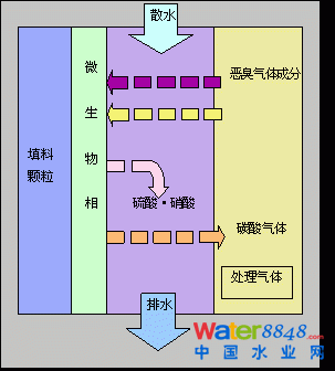 a.惡臭氣體接觸到受散水而濕潤的填料(生物媒)表面的水膜而溶解。