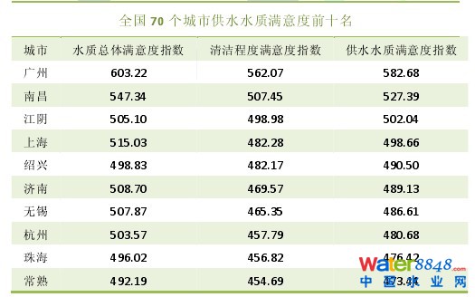 調查結果顯示,全國70個城市中,廣州市的供水水質滿意度指數最高,達582.68分,南昌、江陰分別以527.39分、502.04分名列第二、第三位,排名四到十位的依次是上海、紹興、濟南、無錫、杭州、珠海、常熟。