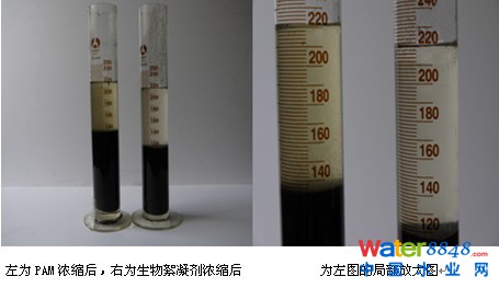 從上述數(shù)據(jù)可以看出,在污泥濃縮方面,生物絮凝劑有著無與倫比的優(yōu)勢,污泥壓縮速度快,脫水率高,上清液清澈透亮