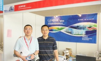 圖為:北京市政院三所馮凱副總工(右)在展臺前合影