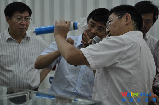 圖為林克慶副市長仔細(xì)察看碧水源反滲透膜元件