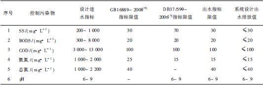 系統(tǒng)設(shè)計日處理量80m3. 設(shè)計進水指標(biāo)及出水排放指標(biāo)見表1 所示. COD、BOD、SS、氨氮、總氮及pH 等為污染排放主要控制指標(biāo), 第四列及第五列分別為以上各指標(biāo)在GB16889- 2008及DB37 /599-2006中的排放限制, 第六列為兩標(biāo)準(zhǔn)的較嚴(yán)格值, 為保證出水達標(biāo), 本設(shè)計各污染物排放值(第七列)應(yīng)低于相應(yīng)第六列限值.