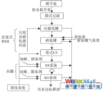 圖1 MBR + 雙膜法(NF/RO)組合工藝流程圖
