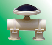 曝氣器采用球冠形結構,膜片采用斜穿切口式打孔技術,其中心頂部有無孔區(qū),且內設兩道環(huán)形止水線,因而具有良好的防堵塞、防倒灌性能。