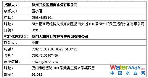 受 漳州開發(fā)區(qū)招商水務有限公司 委托,廈門天和項目管理投資咨詢有限公司以 公開招標 方式進行以下項目的招標,歡迎具備相應資格條件的承包人參與投標,現(xiàn)將招標有關事宜公告如下: