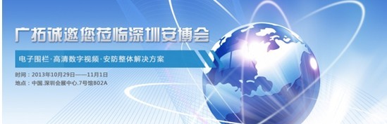 2013年10月29日-11月1日金秋收獲之際,全球最具影響力的安防行業(yè)盛會---第十四屆中國國際公共安全博覽會將于深圳會展中心隆重舉行。應主辦方的邀請,廣拓將參加此次盛會,展位號為7號監(jiān)控館B02A。