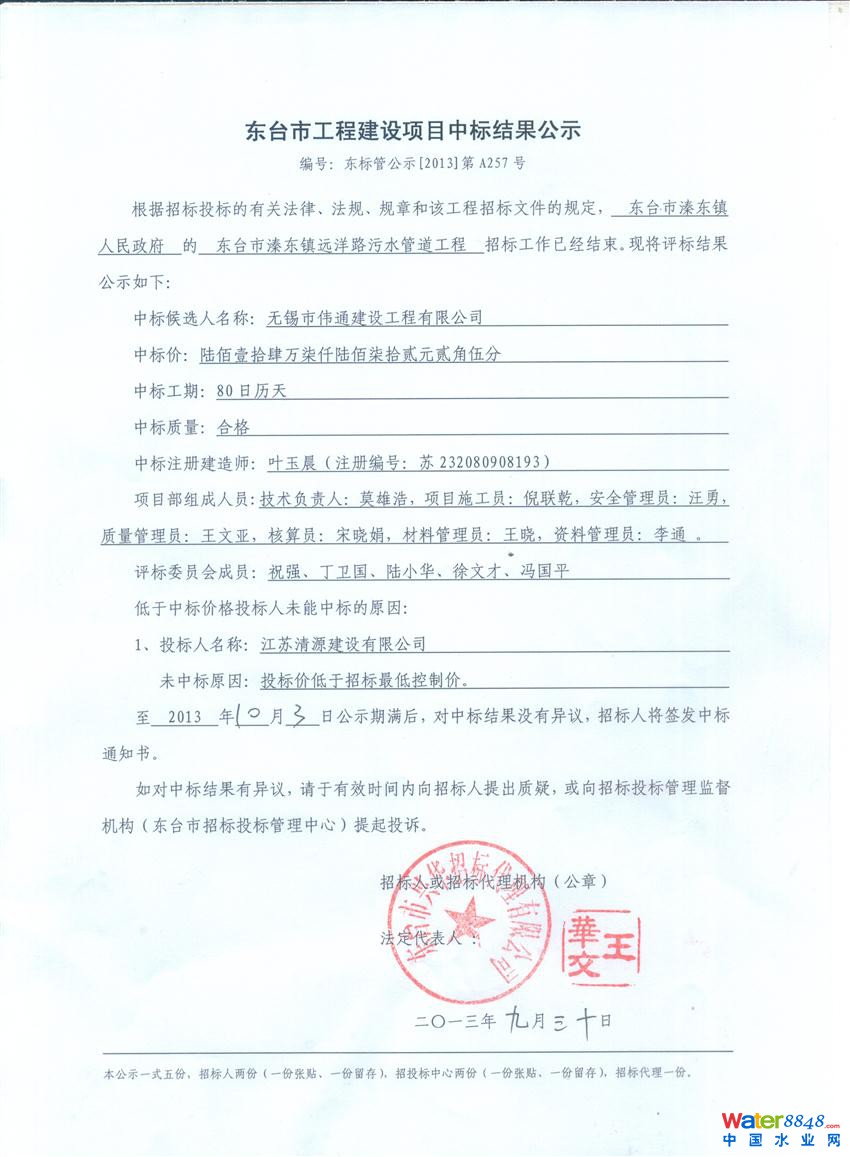 江蘇東臺市溱東鎮(zhèn)遠(yuǎn)洋路污水管道工程預(yù)中標(biāo)