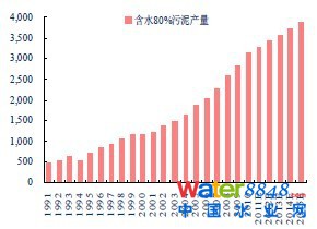 圖1:91~15 年我國濕污泥產(chǎn)生量 (萬噸)。
