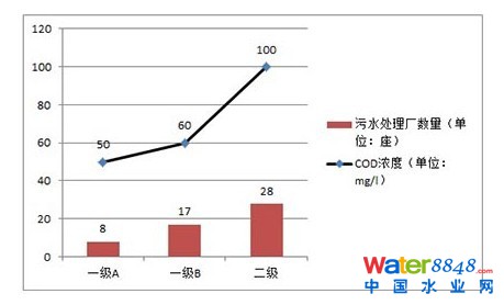 按照國家標準,污水處理廠污染物排放標準由高到低分為一級A、一級B和二級三類,尾水中的COD濃度限值從50mg/l、60mg/l到100mg/l依次升高。而上,F有污水處理廠的排放標準總體等級偏低,8成污水處理量只達到二級標準。