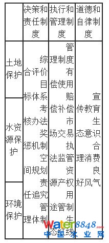 黨的十八大報告提出了生態(tài)文明制度建設(shè)的主要任務(wù):“要把資源消耗、環(huán)境損害、生態(tài)效益納入經(jīng)濟(jì)社會發(fā)展評價體系,建立體現(xiàn)生態(tài)文明要求的目標(biāo)體系、考核辦法、獎懲機(jī)制。建立國土空間開發(fā)保護(hù)制度,完善最嚴(yán)格的耕地保護(hù)制度、水資源管理制度、環(huán)境保護(hù)制度。深化資源性產(chǎn)品價格和稅費(fèi)改革,建立反映市場供求和資源稀缺程度、體現(xiàn)生態(tài)價值和代際補(bǔ)償?shù)馁Y源有償使用制度和生態(tài)補(bǔ)償制度。積極開展節(jié)能量、碳排放權(quán)、排污權(quán)、水權(quán)交易試點(diǎn)。加強(qiáng)環(huán)境監(jiān)管,健全生態(tài)環(huán)境保護(hù)責(zé)任追究制度和環(huán)境損害賠償制度。加強(qiáng)生態(tài)文明宣傳教育,增強(qiáng)全民節(jié)約意識、環(huán)保意識、生態(tài)意識,形成合理消費(fèi)的社會風(fēng)尚,營造愛護(hù)生態(tài)環(huán)境的良好風(fēng)氣。”十八屆三中全會進(jìn)一步完善了生態(tài)文明制度體系的內(nèi)容:“要健全自然資源資產(chǎn)產(chǎn)權(quán)制度和用途管制制度,劃定生態(tài)保護(hù)紅線,實(shí)行資源有償使用制度和生態(tài)補(bǔ)償制度,改革生態(tài)環(huán)境保護(hù)管理體制。”