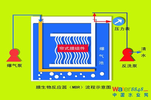 膜-生物反應器(Membrane Bio-Reactor,簡稱MBR)是一種由膜分離技術與生物處理技術有機結合的新型態(tài)廢水處理系統(tǒng),取代傳統(tǒng)活性污泥系統(tǒng)中占地較大的二沉池,利用沉浸于好氧生物池內之膜分離設備截留槽內的活性污泥與大分子固體物,活性污泥(MLSS)濃度可達到10g/L以上,污泥齡(SRT)可延長30天以上,如此高濃度系統(tǒng)大大降低了生物反應池體積和建工作業(yè)量,產(chǎn)水水質可達到國標GB8978-1996污水綜合排放的一級A標準,成為21世紀污水處理與水資源回收再利用的最優(yōu)選擇。