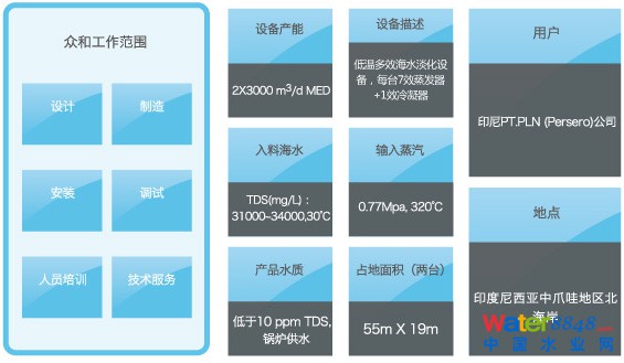 項目概況:2X315MW燃煤電廠位于印度尼西亞東爪哇地區(qū)南岸,離巴齊丹(Pacitan)往東約30Km。為促進當(dāng)?shù)胤e極發(fā)展,解決用電問題,2007年新建巴齊丹2X315MW燃煤電廠,由于該地區(qū)嚴重缺水,電廠建設(shè)運行所需用水均來自于眾和提供的2X3000m3/dMED海水淡化設(shè)備。