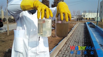 2月14日,永寧縣第二污水處理廠的工作人員拿著兩瓶水樣,右為經過企業(yè)初次處理后的污水,左為經過污水處理廠二次處理后的污水。 記者 鄭崢 攝