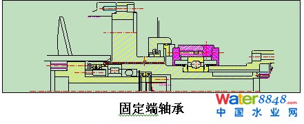 固定端主軸承采用深溝球軸承。它能同時承載徑向與軸向兩個方向的載荷。螺旋軸承采用NG型滾柱軸承與推力軸承的組合,分別承載螺旋的徑向、軸向載荷。如下圖所示。