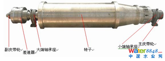 離心機(jī)采用開放式結(jié)構(gòu),將差速器、主軸承等經(jīng)常需要維護(hù)的部件外置,這樣,維護(hù)、維修差速器、更換主軸承就變的非常方便(如上圖所示)。