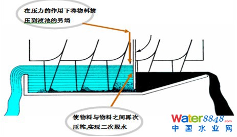 其二、螺旋推料器采用雙錐角加緩沖板結(jié)構(gòu),在前端兩個螺葉間加BD板作雙向擠壓,由于緩沖板的作用,提高了轉(zhuǎn)鼓液池深度,增強(qiáng)了泥餅之間的擠壓力,達(dá)到污泥二次脫水效果,由于雙錐角的作用使泥餅排放順暢, 從而提高處理能力并降低了藥耗量。