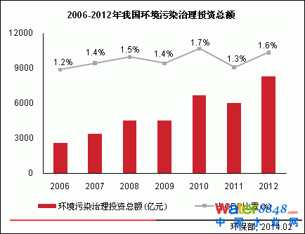 環(huán)保政策的密集出臺(tái)進(jìn)一步推動(dòng)了我國環(huán)境污染治理投資總額的攀升,2006-2010年,我國環(huán)境污染治理投資總額呈逐年增加趨勢(shì),經(jīng)過2011年的小幅回落之后,2012年大幅增長(zhǎng)。2012年,全國環(huán)境污染治理投資為8253.6億元,占當(dāng)年國內(nèi)生產(chǎn)總值(GDP)的1.6%(見圖4)。
