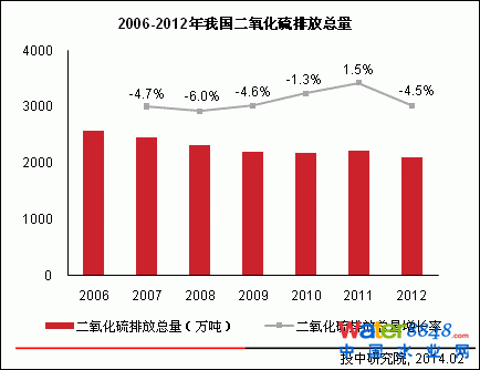 二氧化硫是主要大氣污染物之一,作為二氧化硫排放大戶的火電市場(chǎng)是大氣污染治理的重點(diǎn)。過去十年,受國家政策扶持及減排力度加強(qiáng)等因素影響,脫硫行業(yè)發(fā)展迅猛,先后經(jīng)過供不應(yīng)求的爆發(fā)性增長(zhǎng)、供大于求的階段性洗牌后逐漸回歸理性,進(jìn)入供需平衡的成熟階段。2006-2012年間,我國脫硫行業(yè)發(fā)展成效顯著,全國廢氣中二氧化硫排放量總體呈現(xiàn)下降趨勢(shì)。2012年,全國二氧化硫排放量2117.6萬噸,比上年減少4.5%(見圖8)。