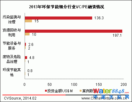 圖2 2013年環(huán)保節(jié)能細(xì)分行業(yè)VC/PE融資情況