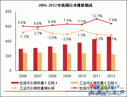 隨著工業(yè)化、城市化進(jìn)程的加速以及人口的不斷增長(zhǎng),污水排放總量呈持續(xù)上升趨勢(shì)。2012年,我國污水排放總量為684.8億噸,比上年增加3.9%。其中,工業(yè)污水排放量221.6億噸,比上年減少3.7%,占污水排放總量的32.3%;生活污水排放量462.7億噸,比上年增加7.9%,占廢水排放總量的67.6%?傮w來看,2006-2012年,我國工業(yè)污水排放量總體上穩(wěn)中有降,但隨著人口的增長(zhǎng),生活污水排放量逐年增加(見圖5)。