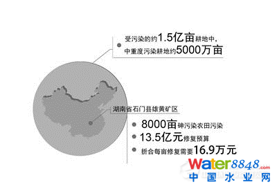 據(jù)不完全調(diào)查,早在2006年中國受污染的耕地約有1.5億畝,占18億畝耕地的8.3%。此外,因污水灌溉而污染的耕地有3250萬畝;因固體廢棄物堆存而占地和毀田的約有200萬畝。