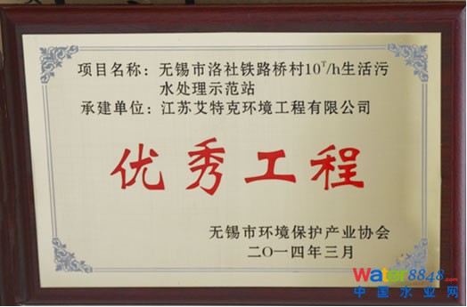 2014年3月20日,江蘇艾特克環(huán)境工程有限公司承建的無錫市洛社鐵路橋10t/h生活污水處理示范工程被評(píng)為2013年度“環(huán)境保護(hù)優(yōu)秀工程”。 |
