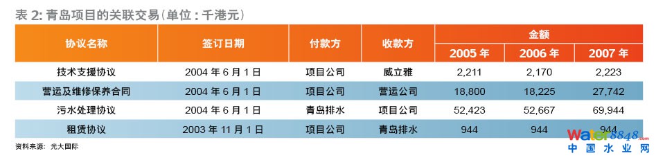 公開(kāi)資料顯示,隨著青島污水量的增加,上述關(guān)聯(lián)交易合同規(guī)定的各項(xiàng)根據(jù)污水處理量調(diào)整的服務(wù)收入也持續(xù)提高,2005年到2007年?duì)I運(yùn)及維修保養(yǎng)合同的收入增長(zhǎng)47.5%,污水處理協(xié)議的收入增長(zhǎng)33.4%。但是,由于關(guān)聯(lián)交易合同各方之間存在利益交叉,原始數(shù)據(jù)并沒(méi)有體現(xiàn)各方的實(shí)際利益,因此結(jié)合股權(quán)結(jié)構(gòu)、盈利分配協(xié)議、抵消關(guān)聯(lián)交易影響重新調(diào)整,才能得到真正的利益分配格局。我們對(duì)原始數(shù)據(jù)合并調(diào)整之后發(fā)現(xiàn),通過(guò)關(guān)聯(lián)交易合同進(jìn)行項(xiàng)目劃分、盈利分配協(xié)議進(jìn)行利益劃分之后,威立雅在青島項(xiàng)目的利益劃分中獨(dú)占鰲頭,獲得污水處理項(xiàng)目56%的收入。其中,2005年到2007年威立雅占有股權(quán)大頭的營(yíng)運(yùn)公司收入增長(zhǎng)47.6%,而光大國(guó)際占有股權(quán)大頭的項(xiàng)目公司收入僅增長(zhǎng)28.1%,營(yíng)運(yùn)公司的收入增速明顯快于項(xiàng)目公司;此外,威立雅不僅收入一直高于光大國(guó)際,而且收入增長(zhǎng)速度也高于光大國(guó)際,兩者之間的收入差額從2005年的700萬(wàn)港元擴(kuò)大到1000萬(wàn)港元(表3)。