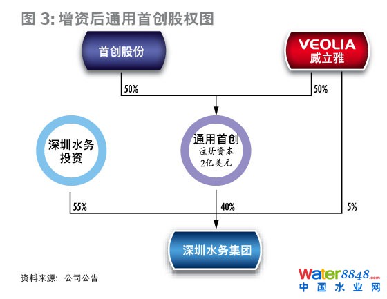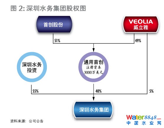 雖然威立雅與首創(chuàng)股份合資收購(gòu)股權(quán),但是從通用首創(chuàng)的股權(quán)比例從增資前的首創(chuàng)股份絕對(duì)控股,調(diào)整為威立雅和首創(chuàng)股份股權(quán)對(duì)等,及威立雅仍舊獨(dú)立持有深圳水務(wù)集團(tuán)5%的股權(quán)來(lái)看,威立雅實(shí)際上在深圳水務(wù)收購(gòu)中掌握主動(dòng)權(quán)。
