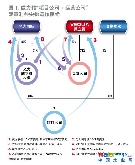 通過(guò)威立雅與光大國(guó)際合作的青島污水處理項(xiàng)目,我們可以了解其如何通過(guò)雙重利益安排的三步走,僅用55萬(wàn)美元就撬動(dòng)了4280萬(wàn)美元的項(xiàng)目,并獲得水務(wù)項(xiàng)目56%的收入。