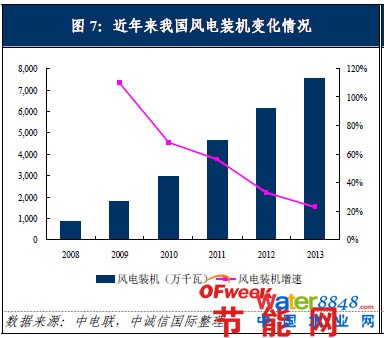 風(fēng)電是近年來(lái)發(fā)展最快的新能,風(fēng)電所發(fā)電量占所有電源發(fā)電量的比重自2008年的低于0.5%逐年增長(zhǎng)至2012年的2.00%左右,2013年進(jìn)一步增長(zhǎng)至2.5%以上。