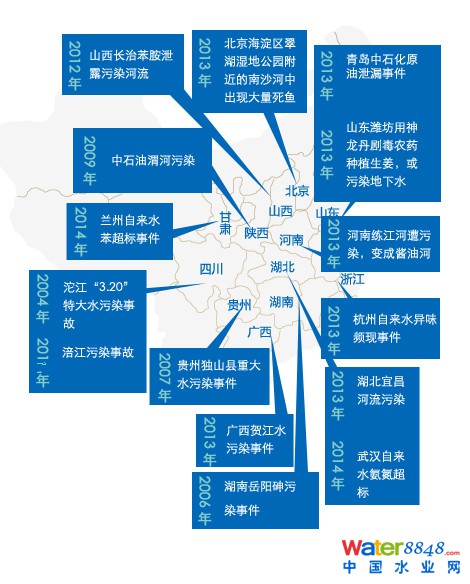 總結(jié)近10年來(lái)發(fā)生的水污染事件分布圖如下: