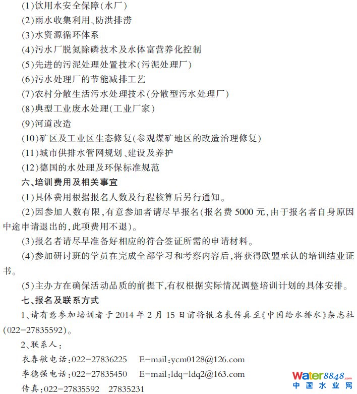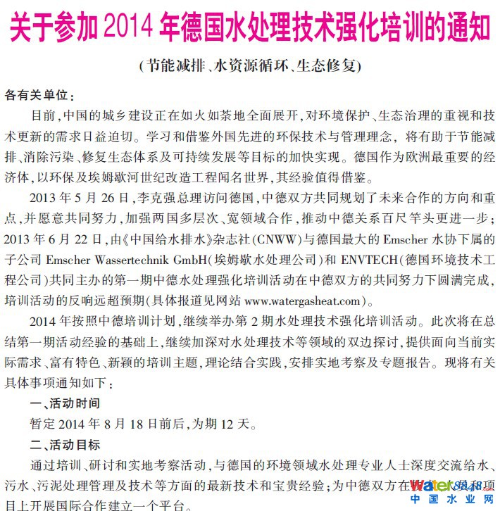 《中國給水排水》雜志社有限公司 關(guān)于參加2014年德國水處理技術(shù)強(qiáng)化培訓(xùn)及考察的通知 (節(jié)能減排、水資源循環(huán)、生態(tài)修復(fù))
