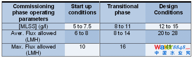 Flux values employed prior to reaching the design conditions were kept conservative, particularly at around 6-7 g/l MLSS when operation was kept well below the critical flux. Average biomass temperature at start-up was slightly above 16ºC.