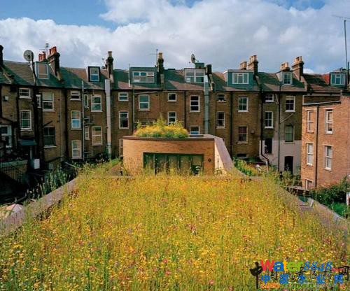 這些傳統(tǒng)舊式倫敦排房的窗戶曾經(jīng)一打開,看到的是破舊的香腸工廠。如今,居民看到的是野花盛開的草坪。這是建筑師賈斯丁·比爾新家的綠屋頂。綠屋頂?shù)母綦x作用有助于提高家用太陽能的利用效率。