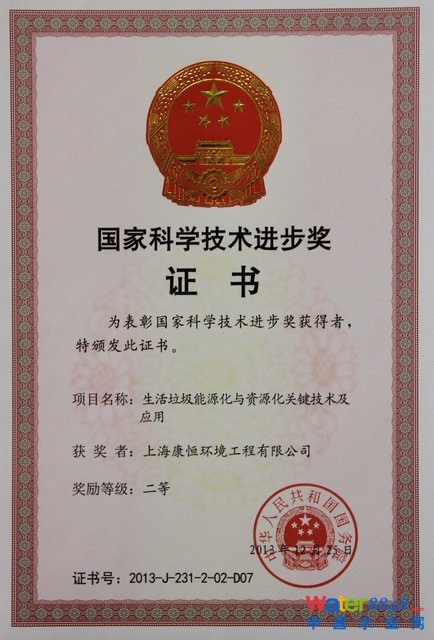 由上?岛悱h(huán)境工程有限公司與同濟(jì)大學(xué)等高校共同開發(fā)的科研課題“生活垃圾能源化與資源化關(guān)鍵技術(shù)及應(yīng)用”經(jīng)過專家審核,榮獲2013年度國家科學(xué)技術(shù)進(jìn)步獎二等獎。