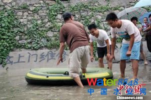 4日下午,大雨過(guò)后,有保定市民拿出充汽艇在積水中玩耍。于俊亮攝