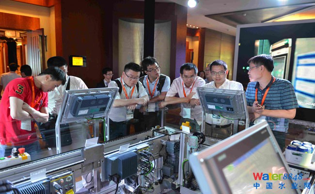 與會嘉賓在西門子工業(yè)論壇先進技術(shù)展示區(qū)進行技術(shù)交流(背景為-西門子全集成自動化TIA展示區(qū))