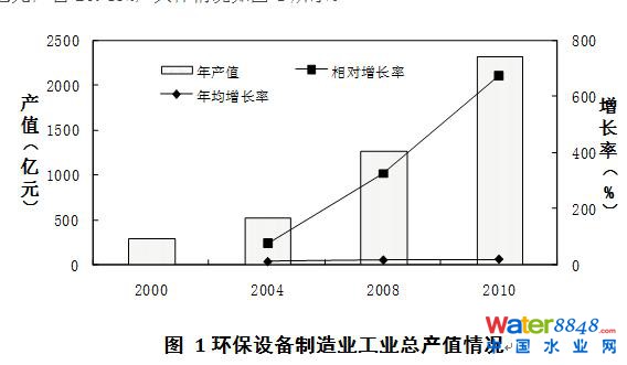 圖 1可知,“十五”和“十一五”時期,我國環(huán)保設備制造業(yè)迅速發(fā)展。2004年相對于2000年增長了76.7%,2000-2004年,環(huán)保設備制造業(yè)市場年均增長率為12.1%。進入“十一五”時期后,環(huán)保設備制造業(yè)發(fā)展速度快速增長,2008年產(chǎn)值對2000年產(chǎn)值來說,增長了3.3倍,2000-2008年,環(huán)保設備制造業(yè)市場年均增長率為17.4%;截止到2010年底,我國環(huán)保設備制造業(yè)年產(chǎn)值近2350億元,比2000年增長了6.8倍,2000-2010年年均增長率為20.5%。