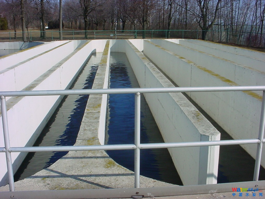 采用氯化消毒,HRT1.75h,下圖是接觸池。需要補(bǔ)充說(shuō)明的是,該廠對(duì)消毒后的出水殘余氯進(jìn)行亞硫酸氫鈉中和,出水排放到密歇根湖。