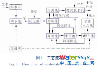 生產(chǎn)廢水和生活污水進(jìn)入集水井,經(jīng)集水井內(nèi)粗格柵和轉(zhuǎn)鼓膜格柵攔截部分大的污染物后,廢水由集水井潛污泵提升至調(diào)節(jié)池,在調(diào)節(jié)池內(nèi)調(diào)節(jié)水質(zhì)水量,出水由潛污泵提升至反應(yīng)池與聚鋁發(fā)生反應(yīng),經(jīng)沉淀池去除大部分SS,出水中的難降解有機(jī)物在好氧池內(nèi)被生物降解,出水經(jīng)中沉池泥水分離后再進(jìn)入MBR 池,進(jìn)行好氧反應(yīng)和膜分離進(jìn)一步降解有機(jī)污染物。MBR 池出水部分直接排入市政污水管網(wǎng),部分通過(guò)泵提升至綠化用水系統(tǒng)和帶式污泥脫水一體機(jī)的反沖洗系統(tǒng)。