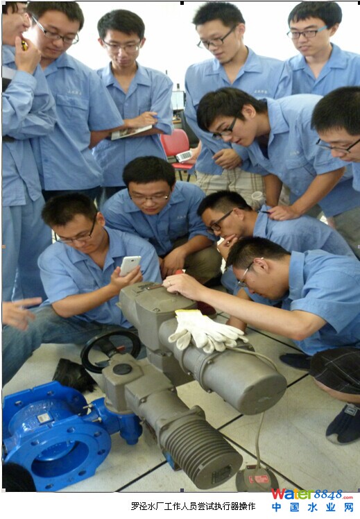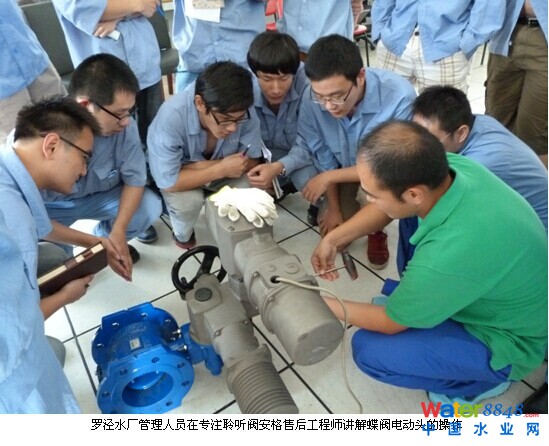 羅涇水廠管理人員在專注聆聽閥安格售后工程師講解蝶閥電動(dòng)頭的操作
