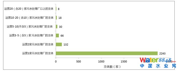 我國城鎮(zhèn)污水處理廠的運營主體比較分散,根據(jù)全國3000多家城鎮(zhèn)污水處理廠的統(tǒng)計,共涉及2497家運營管理主體,平均1家主體運營管理1.4家污水處理廠。其中,2243家主體僅運營、管理1座污水處理廠;132家主體運營、管理2座污水處理廠;66家主體運營管理3-5家(含5)污水處理廠;30家主體運營、管理5-10( 不含5)家污水處理廠;18家主體運營、管理10-20(含10)家污水處理廠;8家企業(yè)主體運營20家及以上污水處理廠。城鎮(zhèn)污水處理廠運營管理主體分布情況如下圖所示。