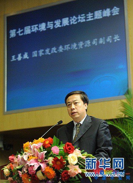 2011年9月22日,第七屆環(huán)境與發(fā)展論壇開幕式在北京舉行,本屆論壇的主題是探索實現(xiàn)“十二五”環(huán)保目標任務(wù)的新理念新舉措。圖為國家發(fā)改委環(huán)境資源司副司長王善成演講。新華網(wǎng) 陳競超 攝