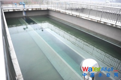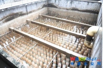 記者看到,在深8米的池中,一根根粘滿絨毛似的生物填料,豎立在池中,數(shù)量達(dá)到上百根。據(jù)介紹,整個(gè)生物接觸池分為兩組,一組分成四格,處理過(guò)后,進(jìn)入常規(guī)工藝的沉淀池。“水進(jìn)入沉淀池后,主要是讓水變清,濾去水中沉淀物,類似于過(guò)去在水中加礬的作用。”