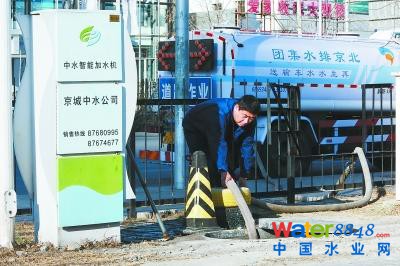 昨天,在位于成壽寺路的方莊再生水廠門口,送水司機(jī)用水帶連接灑水車和再生水取水口后,將用戶卡插入中水智能加水機(jī)抽取再生水。記者 方非攝