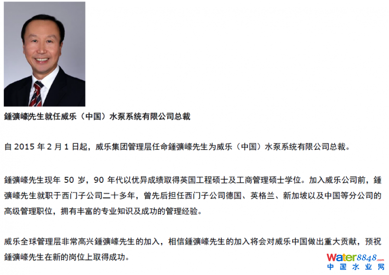 核心提示:威樂(中國)水泵系統(tǒng)有限公司 新就任總裁
